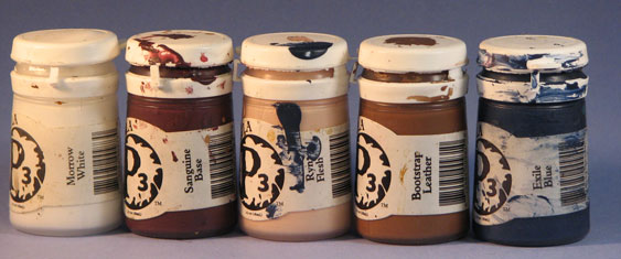 The five colors you see here are the only ones that made it onto to the mini. Anything that doesn’t look like one of these colors is actually a mix of two or more of them. For example, the grey armor was actually brown and blue mixed together, highlighted with the fleshy pink (a client of mine gave me the idea of highlighting non metallic metals with pink).